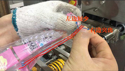 1)包裝膜安裝好后,開機(jī)測試,包裝膜制袋后,出現(xiàn)如下圖包裝袋背面封口左邊袋子邊比右邊袋子邊短小的情況。接下來根據(jù)包裝膜拉膜跑偏的情況調(diào)節(jié)包裝機(jī)的成型器。